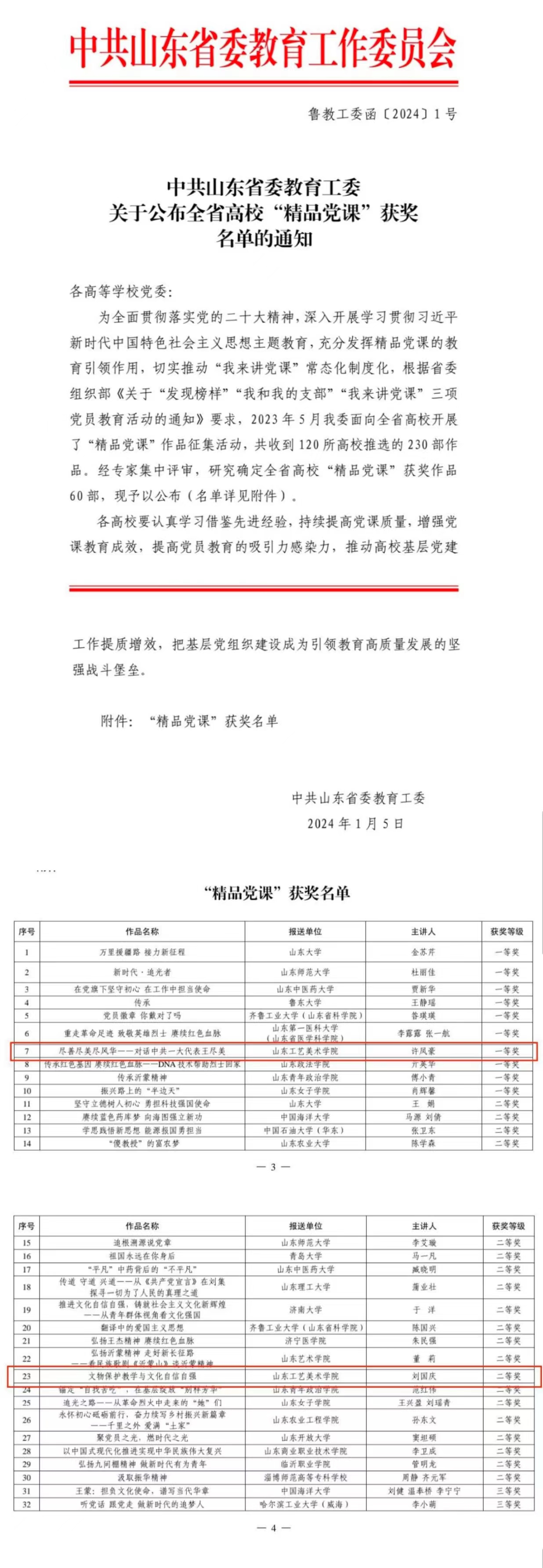 近日,山东省委教育工委公布了全省高校“精品党课”获奖名单,共评选出全省高校“精品党课”获奖作品60部,其中一等奖10部、二等奖20部、三等奖30部。永利官网数字艺术与传媒学院党总支教工党员许凤豪主讲的《尽善尽美尽风华——对话中共一大代表王尽美》获评一等奖,人文艺术学院党总支教工党员刘国庆主讲的《文物保护教学与文化自信自强》获评二等奖。