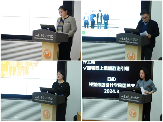 团委书记杜鹏主持会议。齐鲁工业大学团委书记万金存、山东艺术学院团委书记王雯、山东管理学院团委书记李美玲、山东农业工程学院团委书记谷晓川,学生工作部部长刘爱民担任考核评委。13位团总支负责人从思想引领、服务大局和服务青年、团学改革、组织建设等主要内容中聚焦一项重点、亮点工作、讲清思路、措施和工作成效进行现场述职。最终,数字艺术与传媒学院团总支、造型艺术学院团总支获评2023年度“红旗团总支”;工业设计学院团总支、现代手工艺术学院团总支、应用设计学院团总支、基础教学部团总支获评2023年度“先进团总支”。