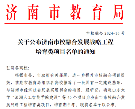 据悉,济南市教育局此次共确定了45个市校融合发展战略工程培育类项目,本项目的获批是对学校在设计教育领域人才培养工作的高度认可。下一步,学校将以此为契机,积极做好人员、平台及资金等项目要素的保障工作,充分发挥自身教育、科研及人才方面独特优势,围绕人工智能赋能艺术设计创新,探索服务区域经济的新质设计人才模式,切实为济南市经济社会高质量发展做出贡献。