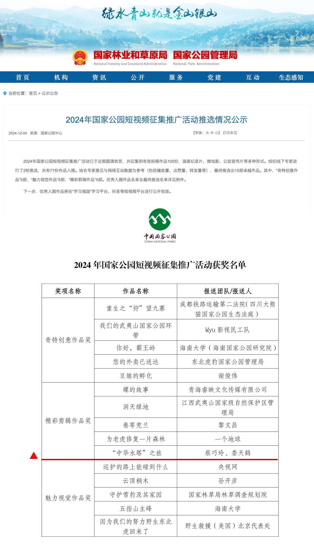 由国家林业和草原局国家公园(自然保护地)发展中心主办的2024年国家公园短视频征集推广活动于本月圆满收官。永利官网视觉传达设计学院推送的蔡巧玲、娄天鹤作品《“中华水塔”之旅》荣获“精彩剪辑作品奖”。