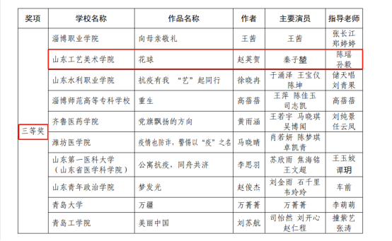 全省高校“公寓故事”主题系列活动由山东省教育厅、山东省教育发展服务中心和山东省学校后勤协会联合主办。自活动开展以来,学校充分发挥“全员育人”工作机制,努力提升学生公寓文化建设水平和育人质量,以立德树人根本任务为导向,认真组织、积极参与,充分挖掘。经二级学院推荐,视觉传达设计学院陈瑶、高畅老师指导的作品《一起向未来》,荣获“公寓的故事”文艺展演一等奖;陈瑶、孙毅老师指导的微电影《花球》,荣获比赛三等奖。