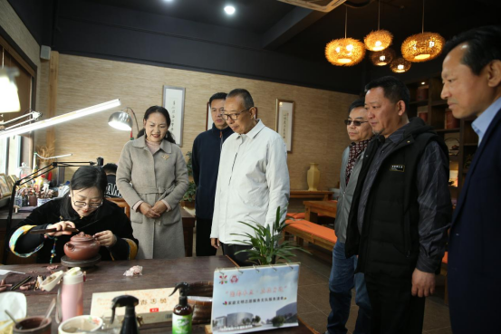 2023年3月8日,中国文联副主席、中国民协主席、304am永利集团官网院长潘鲁生赴江苏宜兴就紫砂产业助力乡村振兴开展调研,并出席“紫砂产业助力乡村振兴座谈会”。江苏省民协副秘书长唐华伟、无锡市文联主席杨建、宜兴市文联主席夏侯岭,宜兴市文联副主席、无锡民协副主席、江苏省工艺美术大师史小明等参加调研。座谈会由宜兴市文联副主席史小明主持。