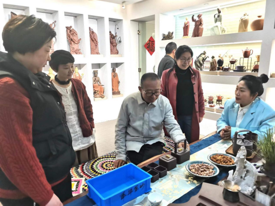 潘鲁生还拜访了中国工艺美术大师徐秀棠先生,走访了宜兴长乐陶庄、徐秀棠大师工作室、范家壶庄范伟群工作室、丁蜀镇西望紫砂陶瓷合作社、周菊英工作室、龙德堂范泽锋工作室、喻小芳工作室、宜兴紫砂九隽陶艺有限公司,参观了江苏省宜兴紫砂工艺厂,并与王潇笠、唐伯琴、王丽萍、汤琴华等座谈交流。