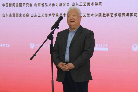 陈光代表山东省见义勇为基金会对本次展览的举行表示热烈的祝贺,对前来参加开幕式的各位朋友表示热烈的欢迎和衷心的感谢。他指出,近年来,山东省各级见义勇为基金会通过广泛地社会宣传和大力表彰见义勇为优秀分子、先进群体,来达到弘扬中华民族见义勇为传统美德的目的,并起到了重要的积极的作用。去年,山东省见义勇为基金会与中国新闻漫画研究会、山东省漫画家协会联合举办了全国见义勇为漫画大赛,我们有幸看到全国31个省、市、自治区包括偏远的西藏自治区都有作者踊跃应征参赛。这让我们深深地体会到用文学、艺术的形式来宣传见义勇为的思想,会起到更好的作用。也使我们更加深刻地认识到文学、艺术的重要特点是形象大于思想,于无声处听到的经历给人的力量会更加强大!