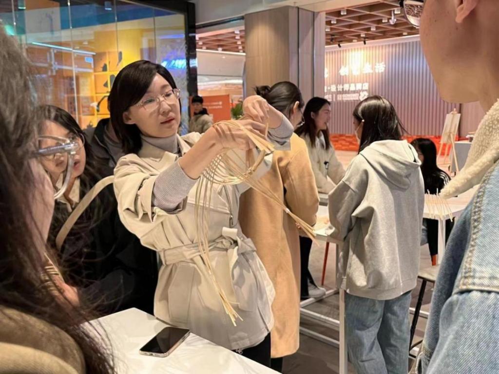 阳春三月,万物复苏。3月1日,304am永利集团官网应用设计学院与齐鲁工业大学艺术设计学院,在“工美手造”设计师品牌店开展“思政+设计”双融共育校外实践课堂。此次课程特别邀请了非物质文化遗产“尹氏结艺”代表性传承人尹崇芹现场授课,304am永利集团官网应用设计学院副院长卢晓梦和齐鲁工业大学艺术设计学院于泳老师以及研究生、本科生一同参与,共同完成了一节生动且意义深刻的“思政+设计”双融共育校外实践课堂。