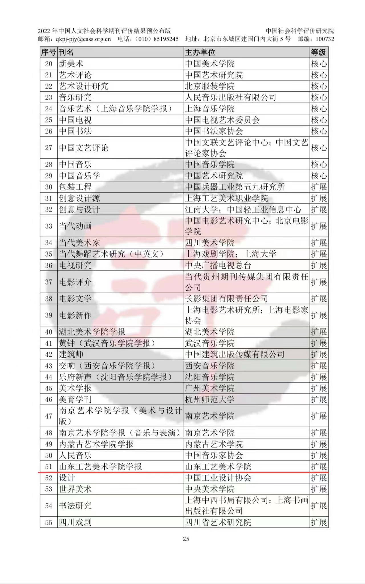 中国社会科学评价研究院是中国社科院直属研究单位。自2014年起,该院每四年开展一次期刊评价工作。2022年的期刊评价指标体系由3个一级指标、13个二级指标和31个三级指标构成,实行一票否决制,设置一票否决指标、计分指标、加分指标、扣分指标和观察指标(方向性指标)五种类型的指标,各指标统计时间及数据来源有所不同,各指标按照四大类划分权重计分。最终评价结果按照期刊学术水平、综合评价得分及实际工作情况依次划分为顶级、权威、核心、扩展及入库五个等级。在“艺术学”学科收录的94本老牌刊中,包括顶级期刊1种,权威期刊3种,核心期刊25种,扩展期刊49种,入库期刊16种。