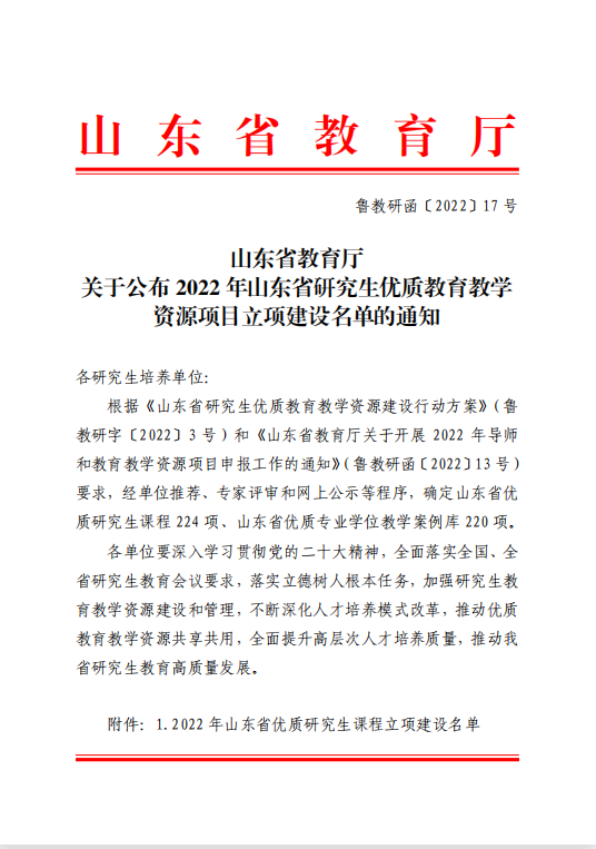 近日,山东省教育厅下发《关于公布2022年研究生导师指导能力提升项目评选结果的通知》(鲁教研函〔2022〕16号)和《关于公布2022年山东省研究生优质教育教学资源项目立项建设名单的通知》(鲁教研函〔2022〕17号),学校获评山东省优秀硕士学位论文3篇、山东省研究生创新成果3项;获批山东省优质研究生课程3门、山东省优质专业学位教学案例库1项。
