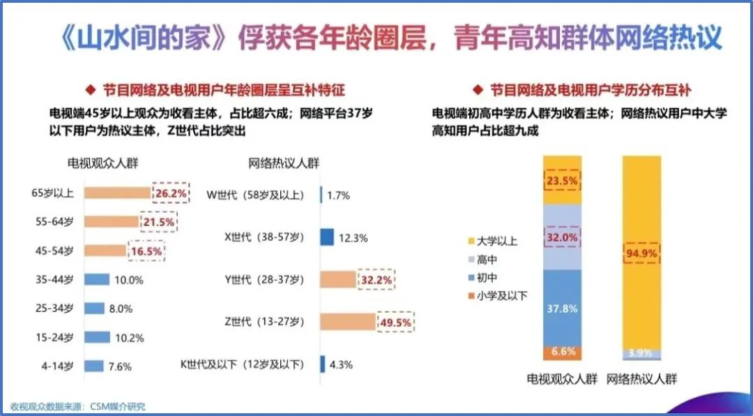 而这部在CCTV-1播出的电视节目,在受众画像上也不同以往,数据显示,节目收视人群年龄在4-24岁年轻观众及大学以上学历观众占比提升明显,节目受众向年轻化靠拢;此外,45岁+的受众在电视端占比超六成,而网络平台讨论人群以37岁以下的用户为主体,13-27岁的Z世代占比近50%,且这部分网络热议人群中大学以上学历的高知群体占比高达94.9%。