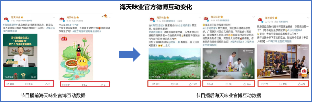 冠名方海天酱油,在每个村庄必备的做饭场景都会有露出机会,强化主打“0添加”、口味适宜的产品心智,成为不同菜系、口味的乡村厨房里的共同选择。通过对比海天味业官方微博的互动数据可以发现,节目相关内容的互动明显高于其他内容,且成倍数增长,节目相关内容最高转赞评数量对比平时转赞评数量翻了近百倍。