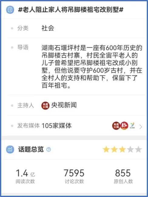 在这些美丽乡村,更多家庭和人的选择也在互联网空间获得了广泛的价值认同。湖南石堰坪村是一座有600年历史的吊脚楼古村寨,全宙平老人留住吊脚楼的努力,让话题#老人阻止家人将吊脚楼祖宅改别墅#阅读量5小时内突破1.4亿,登陆微博热搜主榜第4位,也让嘉宾作家、故宫博物院文化传播研究所所长祝勇感慨这是“吊脚楼的博物馆”,坦言:“希望将来能有更多机会回归到乡土大地当中,能够触摸到文明源流的力量。”