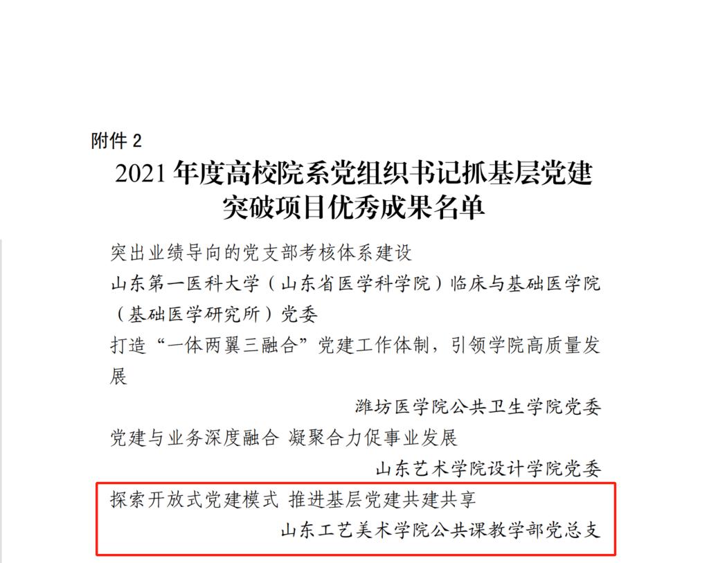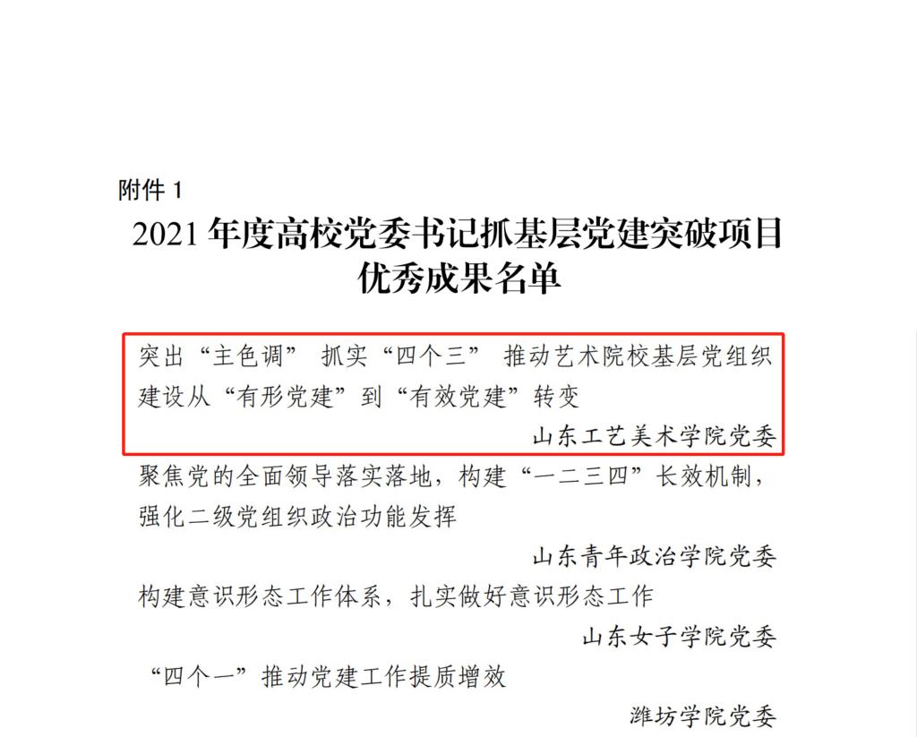 近日,中共山东省委教育工委公布了2021年度高校党委(院系党组织)书记抓基层党建突破项目优秀成果,永利官网《突出“主色调” 抓实“四个三” 推动艺术院校基层党组织建设从“有形党建”到“有效党建”转变》、《探索开放式党建模式推进基层党建共建共享》分别获得2021年度高校党委书记、院系党组织书记抓基层党建突破项目优秀成果。