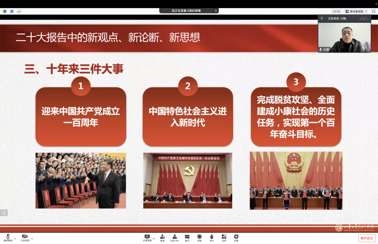 为切实做好党的二十大精神学习宣传贯彻工作,统一师生思想、凝聚学院力量,根据学校工作安排,12月26日,党委委员、统战部部长孙大刚为视觉传达设计学院、创新创业学院教职工作党的二十大精神主题宣讲。