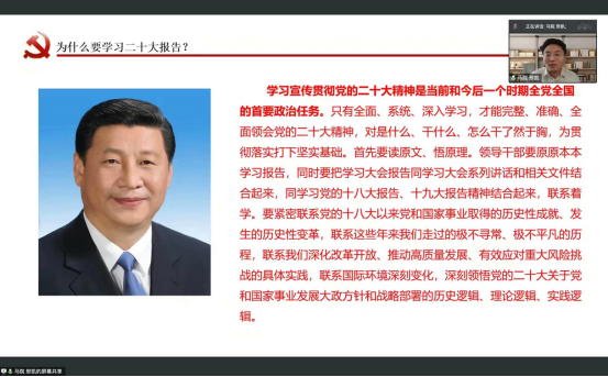 青岛基地管委会委员、党支部副书记王向学主持宣讲会时表示,邢凯老师的宣讲深入讲述了党的二十大的背景、内涵、意义和实践,大家要坚定不移,听党话、跟党走,怀抱梦想又脚踏实地,敢想敢为又善作善战,立志做有理想信念、有道德情操、有扎实之学、有仁爱之心的新时代教师,为全面建设社会主义现代化国家,全面推进中华民族伟大复兴而团结奋斗。