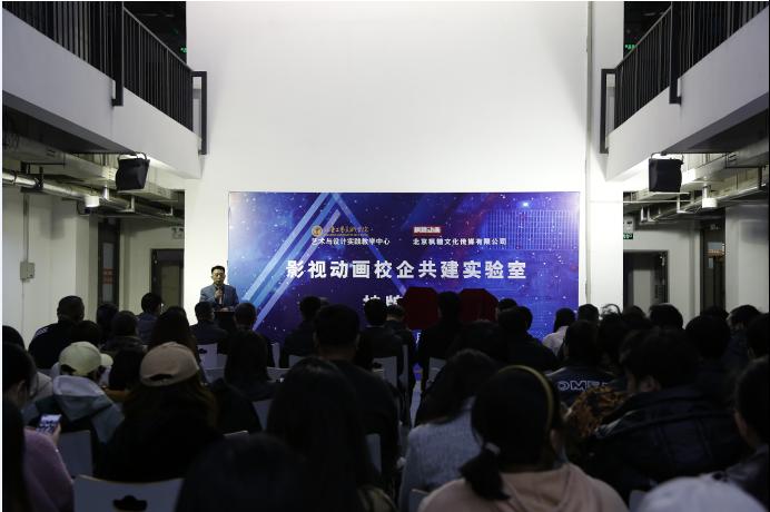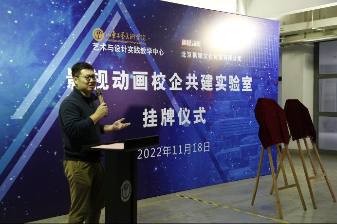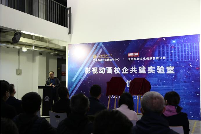 仪式上,高振堂介绍了校企共建影视动画实验室的基本情况。校企共建影视动画实验室,是艺术与设计实践教学中心与北京枫糖文化传媒有限公司联合为二级学院搭建的实践教学平台,借助平台充分发挥校企各自的优势,形成市场、技术与人才的互补,共同培育创新型复合型人才,加大教学成果的产出与转化,使学校、企业和学生三方收益。