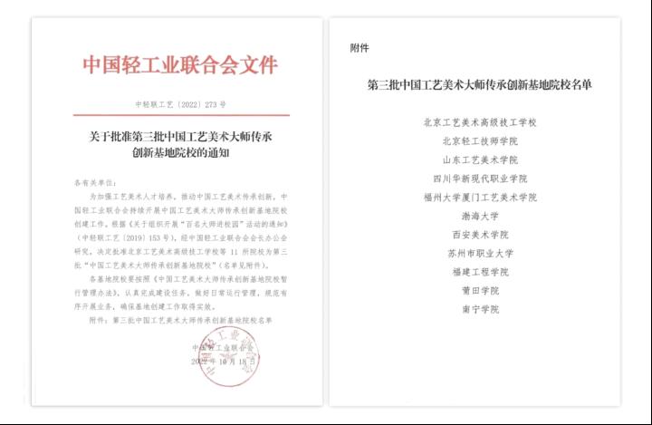 会上举行了“中国工艺美术大师传承创新基地院校”授牌仪式,中国轻工业联合会党委常委、纪委书记陶小年宣读了《关于批准中国工艺美术大师传承创新基地院校》的通知,304am永利集团官网、西安美术学院等11所院校获批“中国工艺美术大师传承创新基地院校”。