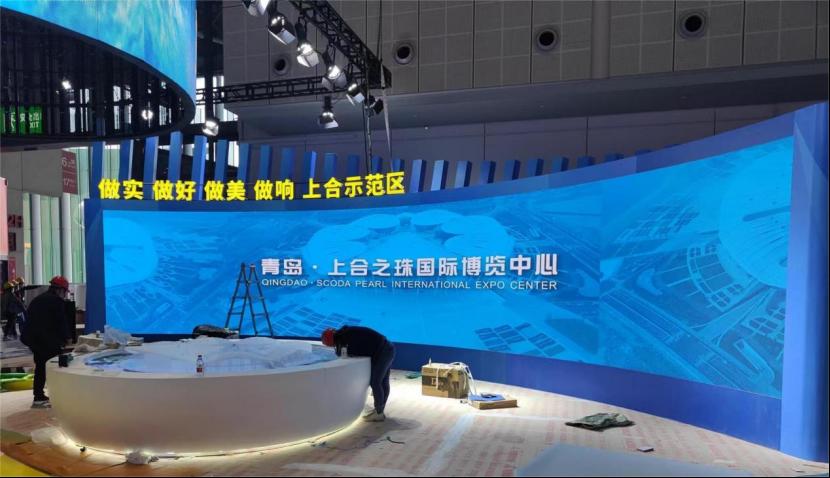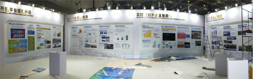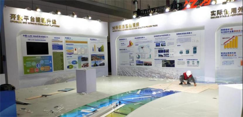 在展示空间上,设计施工团队利用有限的场地面积,合理规划展板内容与展示动线,上合示范区和序厅衍生于主视觉形象,展区巧妙的将齐鲁文化与黄河文化融合,采用简约时尚的风格打造出通透开放的前厅。尾厅为平台、贸易、外资和走出去四大特色板块,分别展示对外开放平台;对外贸易的新业态、新模式、新成果;山东优势产业、引资项目、招商引资政策环境;山东共建“一带一路”和推动企业“走出去”取得的丰硕成果等四部分内容。整个展示空间方圆结合、开合有度,聚焦山东高质量发展,主动服务国家开放大局,打造对外开放新高地的伟大愿景。