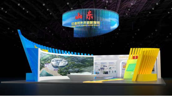 展区整体造型衍生于展区的主视觉形象。设计方面采用多线条组合的形式以及放射状的形态,寓意开放、多样与活力四射的进出口产业形态。展区内由弧线、曲线及丰富的流线组成,黄蓝结合寓意“黄河入海”,蕴含“开放”与山东积极主动融入共建“一带一路”,推动企业“走出去”,主动服务国家开放大局的理念。