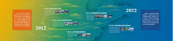 山东展区展板设计延续“黄河入海”的颜色基础,以图片、文字、图表、多媒体视频、数据可视化等多种形式表现了山东这十年的主要对外开放成就。