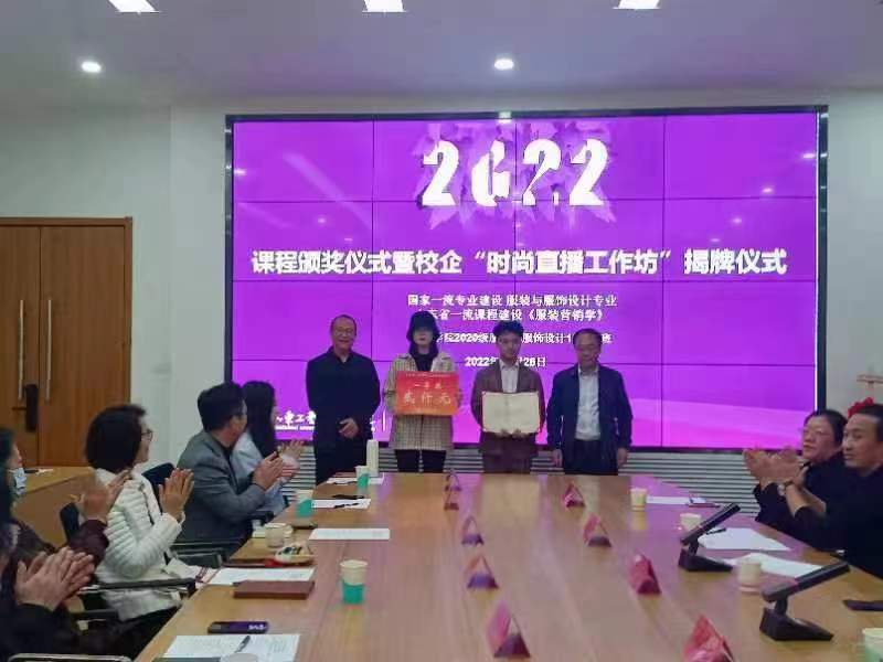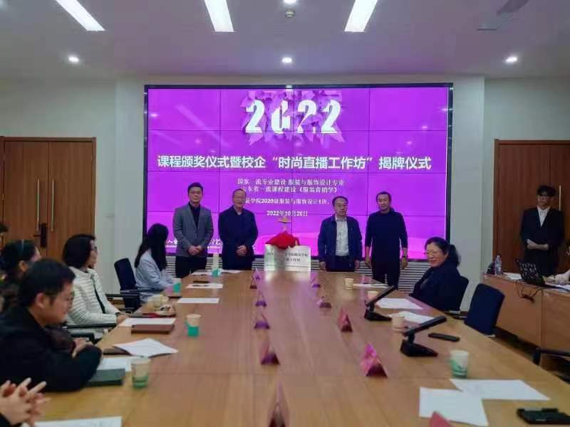 活动的最后,董占军、教务处处长顾群业为课程获奖团队颁奖,并共同为服装学院“时尚直播工作坊”揭牌。