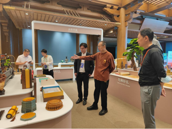 9月25日,院长潘鲁生到第八届尼山世界文明论坛—“中华手造·山东手造”展示展销活动布展现场检查指导工作,孔子文旅集团孟进总经理陪同参观。“中华手造·山东手造”展示展销活动设计团队负责人张焱汇报了策展、组展、设计、实施和布展等相关情况。
