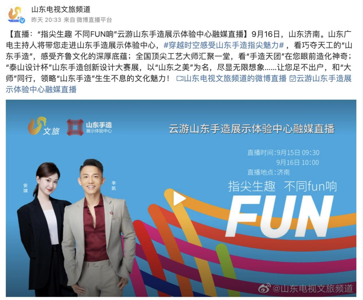 9月16日上午,山东电视台文旅频道开展的“指尖生趣 不同FUN响”云游山东手造展示体验中心融媒直播在济南泉城路“山东手造”展示体验中心开播,直播期间主持人深入了解和体验了“工美手造”设计师品牌店的欧洲设计中心展销区、独立设计师品牌展销区、国家形象展销区、城市文创展销区、青春力量展销区、艺术创意咖啡、手造研学体验七大板块内容,对设计师品牌店内的产品赞不绝口。在直播评论区,“工美手造”设计师品牌店内许多具有独特创意和山东文化特色的文创产品受到了观者的点赞和关注。