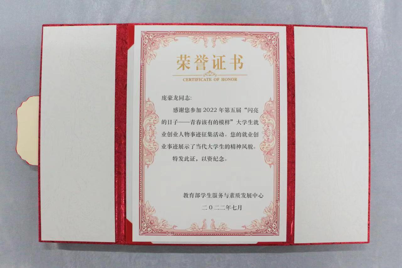 近日,全国第五届“闪亮的日子—青春该有的模样”大学生就业创业人物事迹征集、表彰活动落下帷幕。由学校推荐报送的工业设计学院2021级退役大学生庞豪龙凭借优异的表现获得此项殊荣。这是永利官网学生在此类活动中取得的突破,充分展示了当代大学生良好的精神风貌。