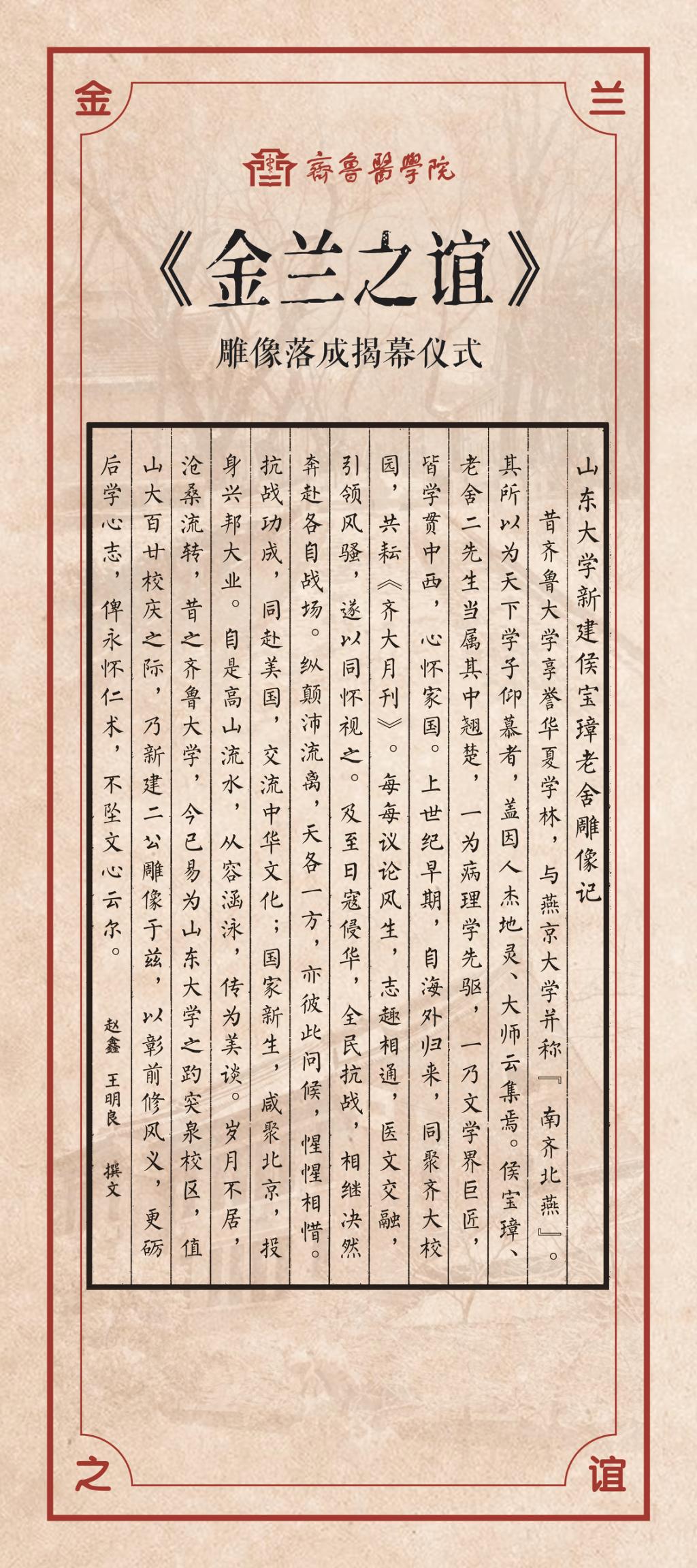 据悉,《金兰之谊》侯宝璋老舍先生雕像为山大百廿校庆献礼工程,为更加生动形象地展现两位先生之间这段跨越岁月的友谊,营造积极向上又充满文化气息的校园氛围,传承齐鲁医学精神,齐鲁医学院自2020年开始精心策划该项目并报经山东大学文化委员会审批。雕像由山东省世博高新医院院长、口腔医学79级校友闫敬武先生进行捐赠。