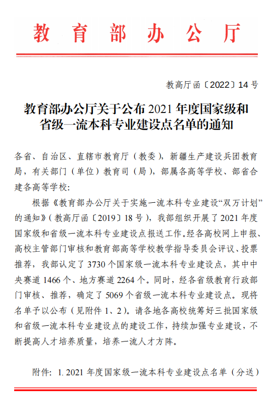 近日,教育部办公厅发布了《关于公布2021年度国家级和省级一流本科专业建设点名单的通知》(教高厅函[2022]14号),经各高校网上申报、高校主管部门审核,教育部高等学校教学指导委员会评议、投票推荐,教育部认定了3730个国家级一流本科专业建设点,其中中央赛道1466个、地方赛道2264个。同时,经各省级教育行政部门审核、推荐,确定了5069个省级一流本科专业建设点。永利官网艺术史论、公共艺术、数字媒体艺术3个专业获批2021年度国家级一流本科专业建设点。广告学、城乡规划、风景园林、舞蹈表演、广播电视编导、戏剧影视美术设计、摄影、书法学8个专业获批2021年度山东省省级一流本科专业建设点。