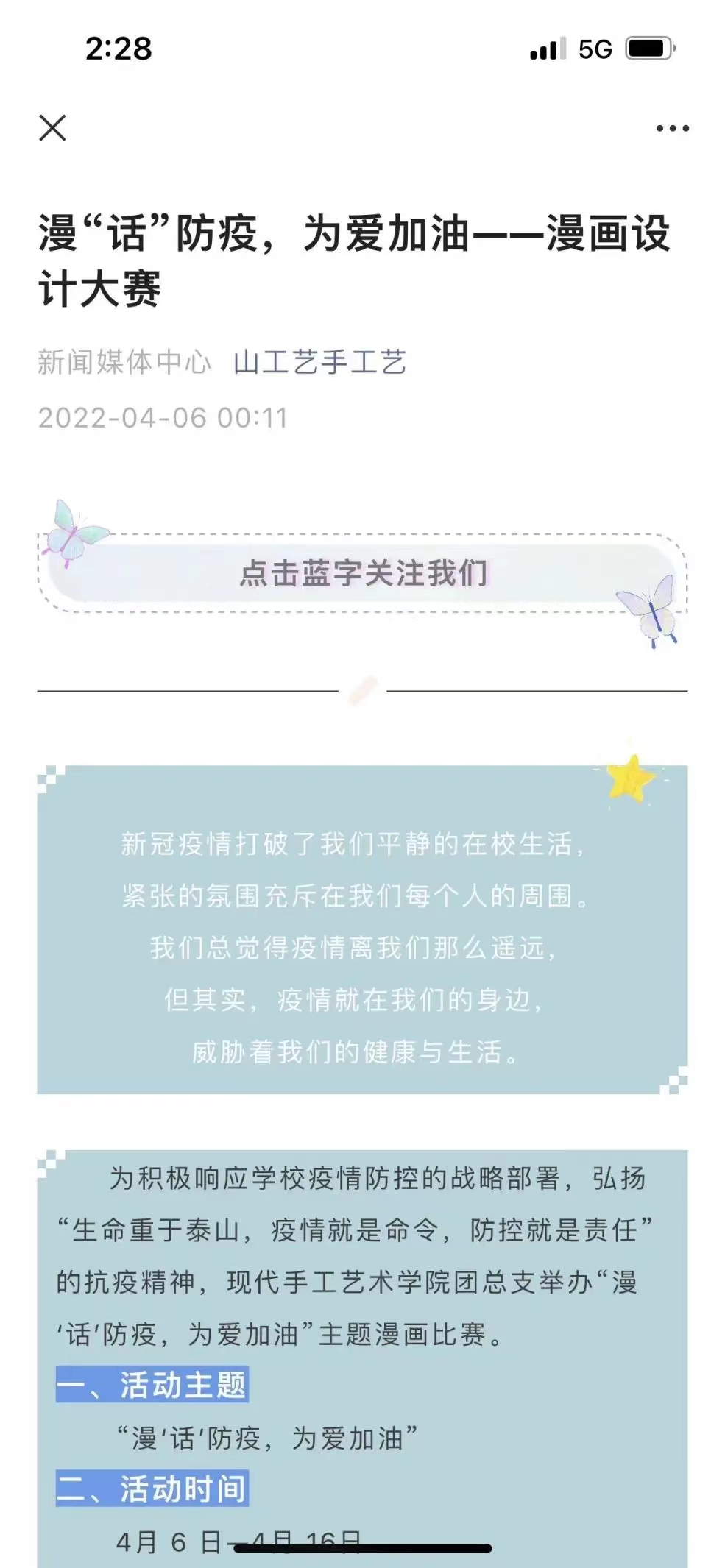 青春的颜色,定是那抹鲜亮的“志愿红”。学生党支部、学生党员们主动“请战”,组建校园疫情防控志愿服务“学生党员突击队”,活跃在防疫宣传、校园巡逻、校园文化各个岗位,争做抗击疫情生力军。造型艺术学院学生党支部全体党员签署“抗疫请战书”,组建“学生党员先锋岗”,协助学院做好宿舍防疫知识宣传、谈心谈话、征求意见。数字艺术与传媒学院学生第一、第二党支部开展“志愿服务”主题党日,协助学生公寓测量体温、信息登记。服装学院学生党支部以宣讲、文艺活动等多种方式在学生中开展爱国主义、集体主义、社会主义核心价值观教育,运用抗疫中涌现出的鲜活素材,讲好抗疫故事。现代手工艺术学院学生党支部指导学生会拍摄记录师生同心抗疫的点点滴滴,《阳光甚好,微风不燥》定格了封校期间每一处春色美景和静谧时光,《疫情下的手艺人》让校外的父母放宽心,也让老师们看到学生的用功与用心。