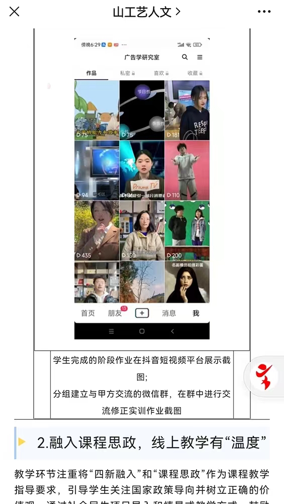 隔空不隔爱,你的冷暖阴晴我先知。视觉传达设计学院党总支组织全体专业教师做好“课程思政”,结合线上教学加强学生思想引领,引导学生健康生活、认真学习、合理宣泄情绪,有问题、有包袱、有矛盾、有困难随时与老师沟通交流。马克思主义学院党总支号召全体思政教师将“思政小课堂”与“社会大课堂”结合起来,将鲜活的抗疫事例与学校抗疫主题创作结合起来,通过讲述身边师生的志愿服务故事,与学生隔空对话,讲活了一堂堂“有温度”的疫情防控思政课。公共课教学部党总支号召老师们推出了最美“中国式”健身八段锦教学视频,指导在校师生科学健身,愉悦身心、增强体魄。
