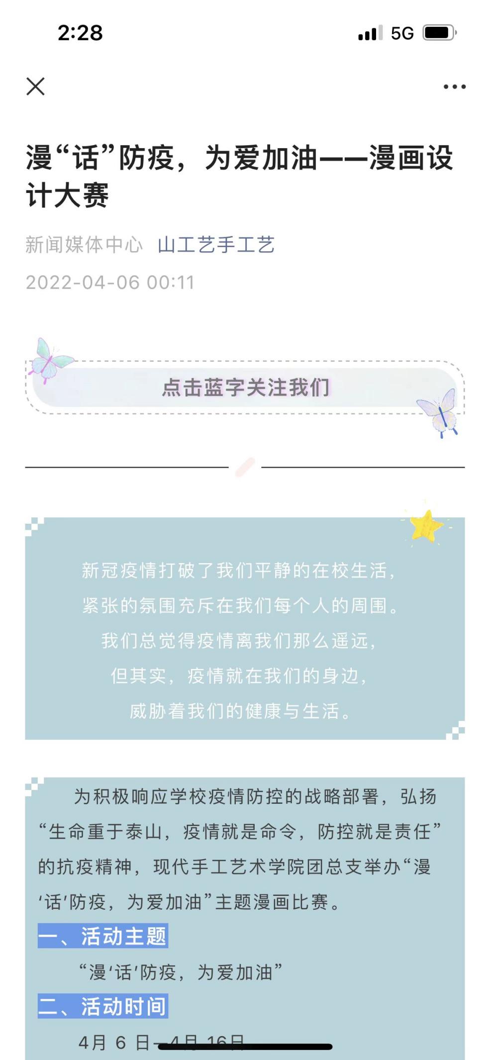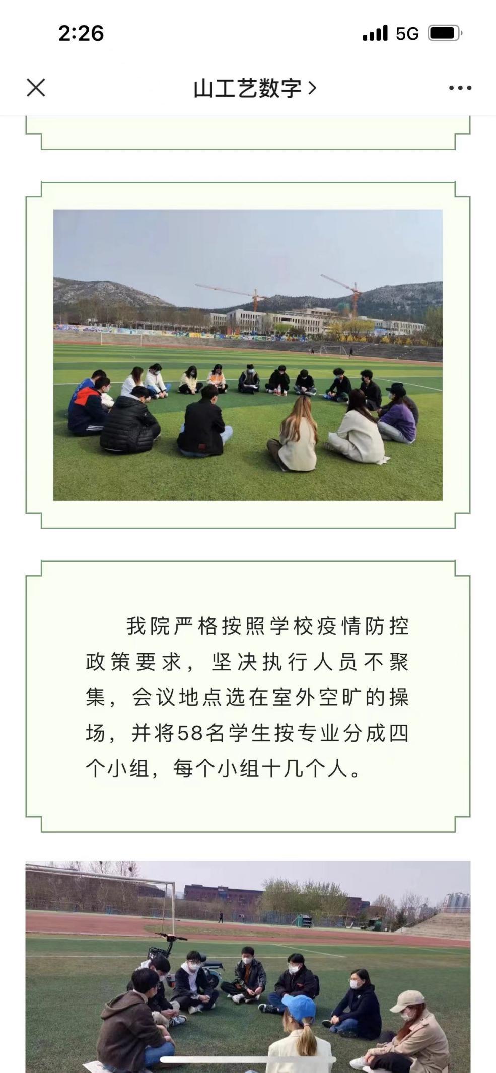 学校封控期间,辅导员积极组织同学们开展“致敬每一个坚守的你,我们有‘画’对您说”“春天,在风筝的斑斓里”“挥拍!让我们击走疫情”“露天座谈会、架起连心桥”“疫情防控知识竞赛”“宿舍装饰大赛”“抛开烦恼,逐梦飞翔”“画说校园”“漫话防疫,为爱加油”“考研经验交流会”“家长进课堂”等一系列活动。引导学生积极参与拍摄《爸妈,我在山工艺挺好的》《防疫手势舞》《春已至,温暖就在眼前》《你安好,我无恙》等视频,传递温暖与感动。