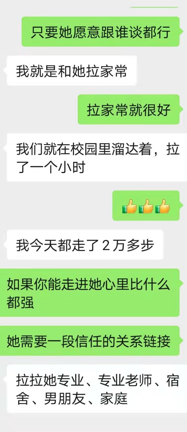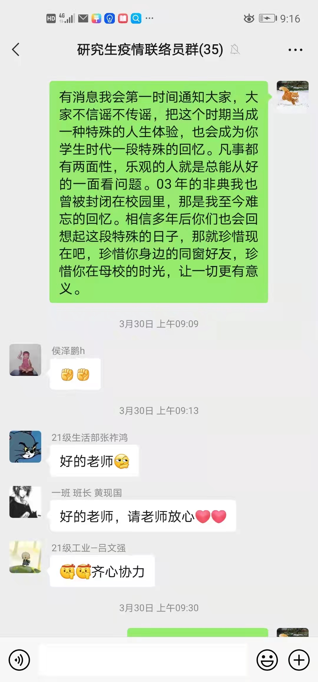 除了24小时在线全天候值班,辅导员还会对集中隔离重点学生进行心理干预,做好情绪疏导,提供暖心支持。“不要怕,不要慌,老师一直都和你们在一起!”看着学生由泪眼婆娑变为破涕大笑,这位同学们眼中的“辅导员姐姐”顿感欣慰,长舒一口气。