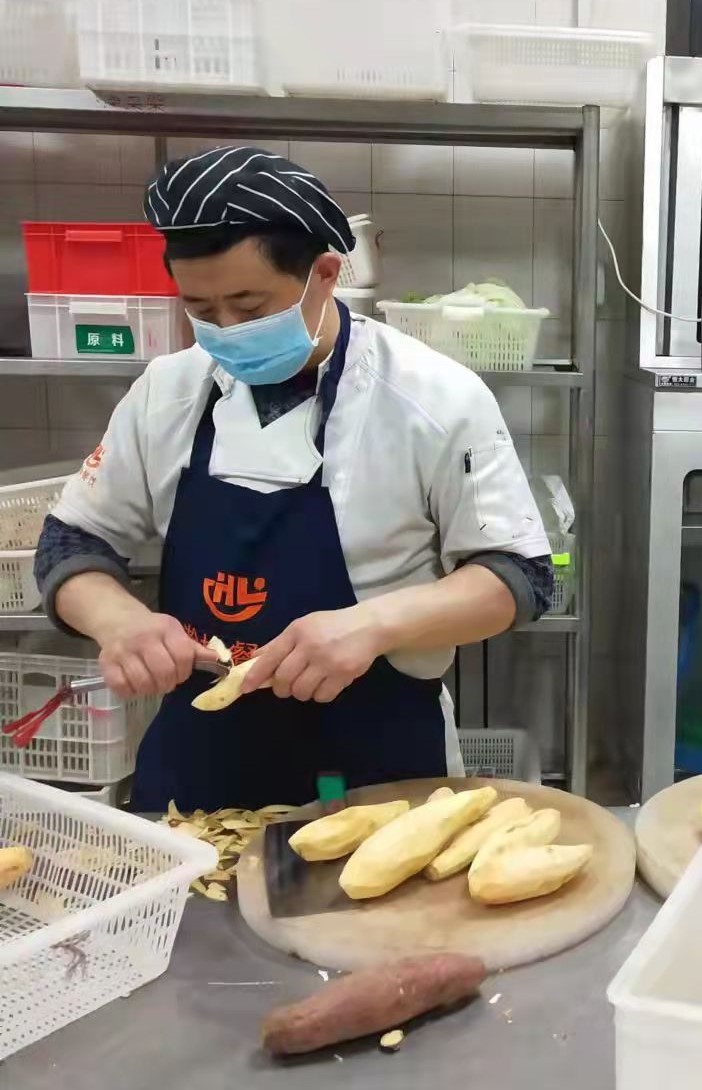 食堂员工晁广明、李爱夫妇,在校工作了十年。十年来,他们每天凌晨3:30准时起床为师生做早餐,一忙就是一整天,蒸包子、炸油条、炒青菜、窗口打饭……由于每天站立时间超过10个小时,致使晁广明内静脉曲张严重,行走出现困难,需要靠药物维持。学校封控管理后,他们把孩子留给家中老人照料,主动申请坚守岗位,照顾师生的一日三餐。“学校就是我的第二个家,家里需要人的时候,咱不能走。”