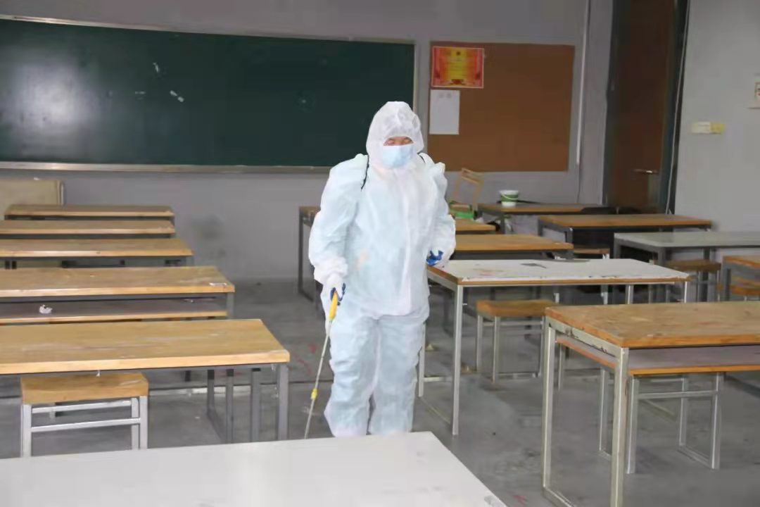 即使数不清这是多少次背起消毒喷洒桶,50多斤的重量还是让保洁苏桂荣下意识地缓了几下才挺起脊梁。办公楼、教学楼、公寓楼、实验楼,一层又一层楼,一步又一个台阶,苏桂荣比以往更认真地做着清扫和消杀工作。“防疫消杀是重中之重,不能放过任何一个角落。”