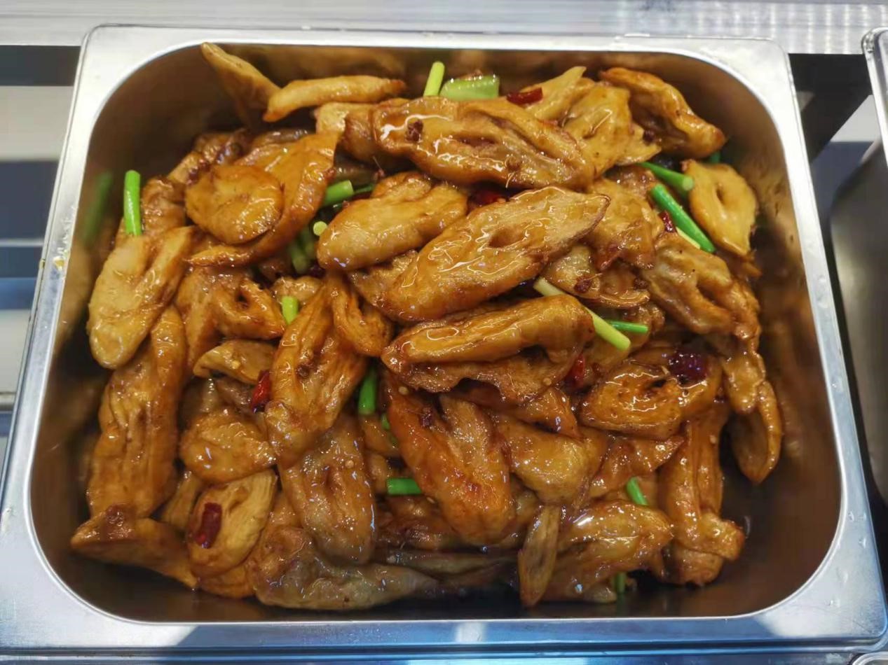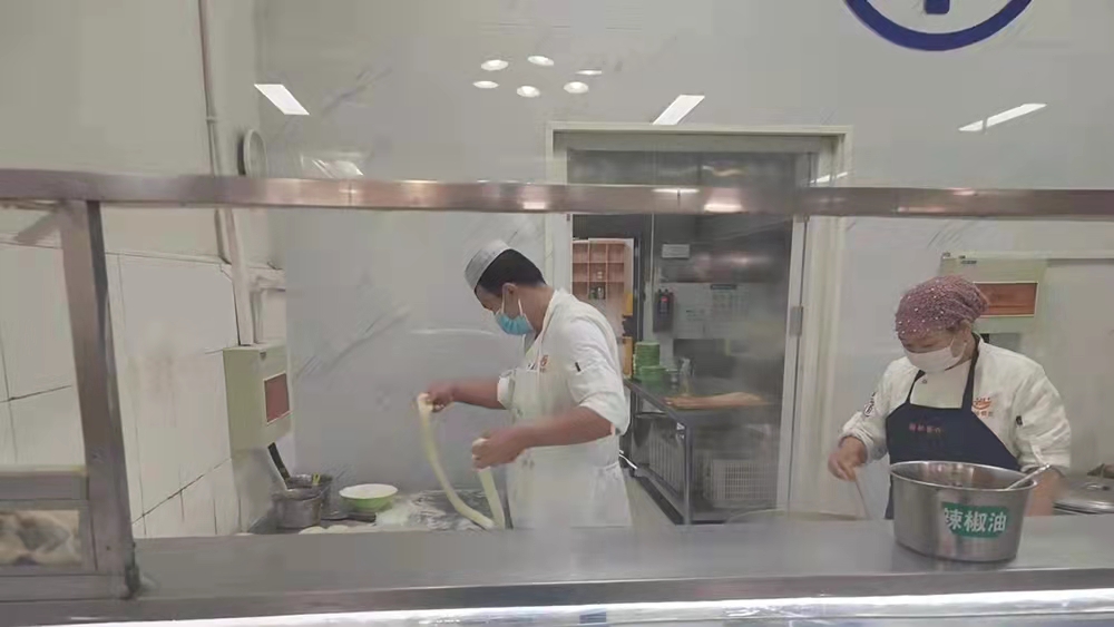 封控期间,学校就餐的师生比平常多出来一两千人,除了正常的餐饮供应,厨余垃圾的清扫、餐具消毒、配菜工作量大大增加,为了减轻洗刷阿姨的工作量,食堂的其他工作人员经常下班了,还跑去一起帮忙。“能多帮点是一点,大家都是一家人”。
