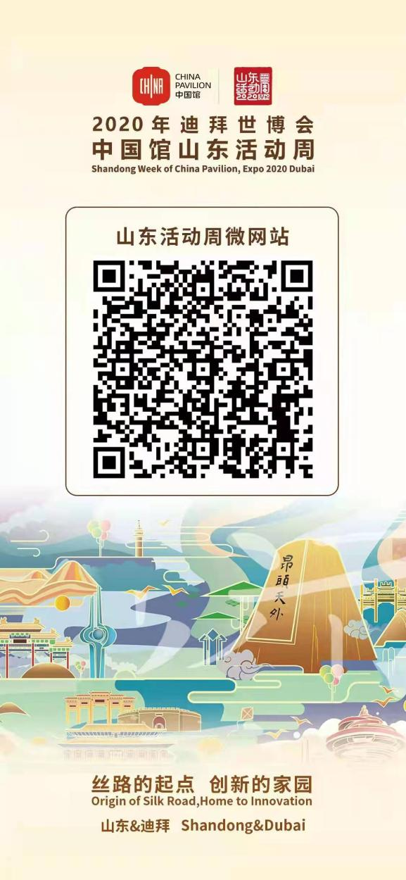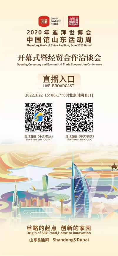 受全球疫情影响,2020年迪拜世博会中国馆山东活动周采取线上举办形式,直播时间:2022年3月22日15:00-17:00欢迎扫描下方二维码进入直播间。