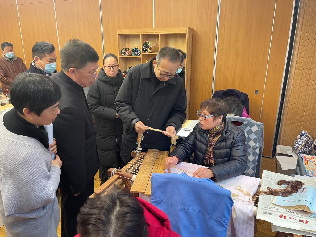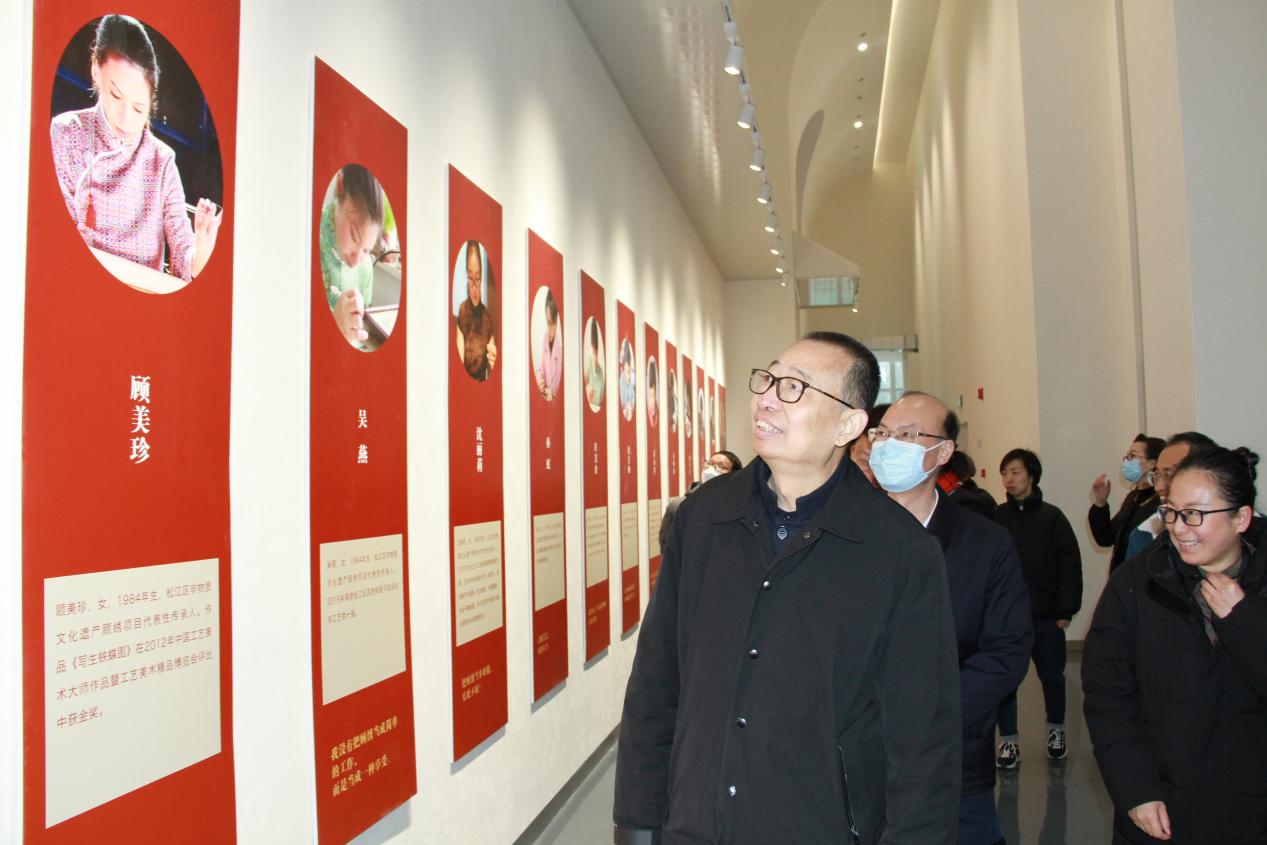 在松江区文化馆顾绣工作室,潘鲁生实地调研了国家级非物质文化遗产“顾绣”加工工艺、流程,详细了解了“顾绣”的传承艺人从业状况和产业发展现状,与传承民间艺人进行了交流,并观看了松江缂丝顾绣艺术精品展。潘鲁生指出,要做好“顾绣”工艺的传承与发展,推动非物质文化遗产进入中小学课堂,打造地方特色文化课程,从基础抓起;要做好非遗传承人的培养工作,加大传统工艺的传承教育工作;要做好产业培育和发展,增强优秀传统工艺和非物质文化遗产的自我造血能力,做到有序发展。潘鲁生认为,非物质文化遗产有传统、有传承也有市场,我们要有精益求精的工匠精神,做好传统工艺的传承和发展,做好中华优秀传统文化的传承与创新发展。