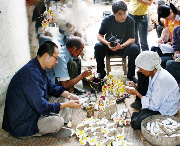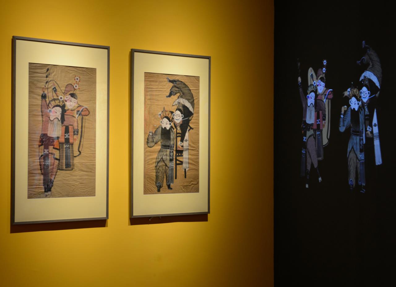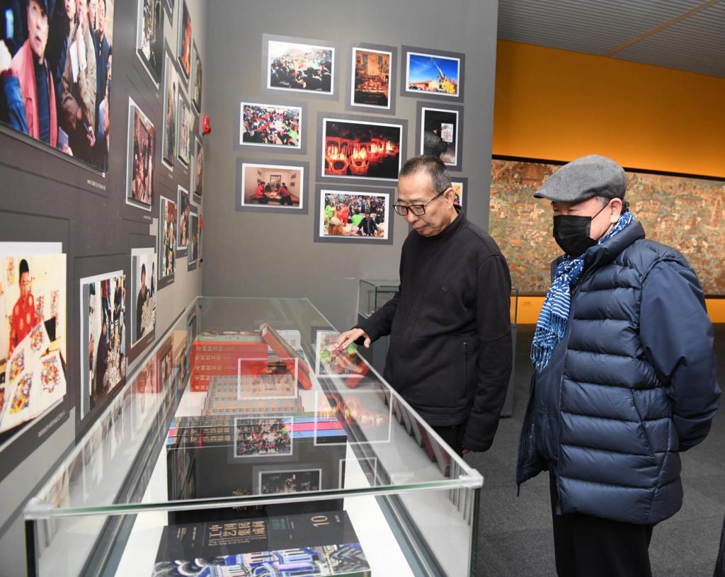 扑灰年画是高密代表性的民间工艺品。莫言边走边看,不时与潘鲁生交流《三盗九龙杯》《打渔杀家》等戏文故事内容。范祚信剪纸是潘鲁生1980年代初高密考察时的收藏,作品构思精巧,造型稚拙淳朴,线条刚劲挺拔,有饽饽花、窗角、窗唇、鞋垫和顶棚花等体裁样式。莫言说,这些东西都是我小时候见过的,没想到今天在国博又见到了它们,特别亲切。