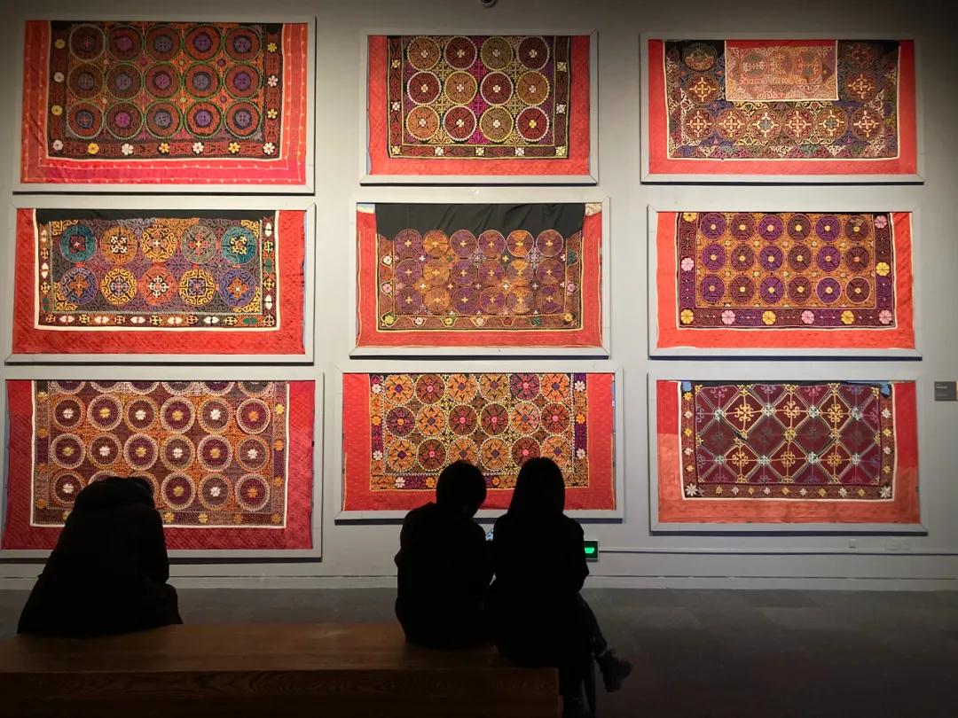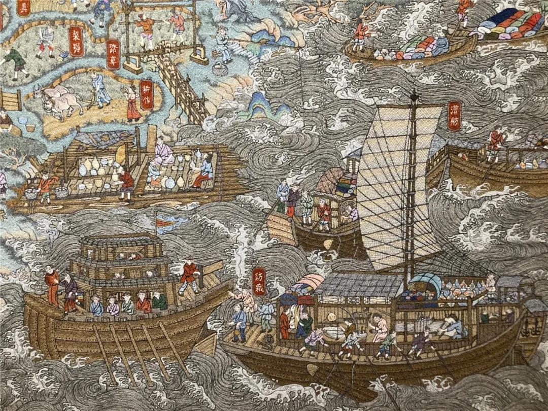 比如在现场一幅近10米长,高2.4米的大幅纤维手绣作品《大匠丝路》令人震撼,这幅作品取材于我国明代百科全书式著作《天工开物》,由潘鲁生带领学生耗时四年完成,作品以“百工匠作”为主题,运用长卷形式描绘了在南北丝绸之路上的传统工匠技艺场景,其中包括手工艺制作、贸易通商及风俗文化的生活画卷,织染、制茶、造纸等传统手工艺鲜活生动,同时描绘了海上丝绸之路上的采珠、贸易经商及造船工艺等,展现了人们在各种海上漕船、海舟等运输工具上运载丝绸、陶瓷、香料的情景。该作品通过表现丝路大匠劳作的场面、技艺传承、风俗习惯等诸多与工匠劳作有关的图像,突出丝路百工匠作的传播历程,表现了丝绸之路上的传统工艺发展与变迁。