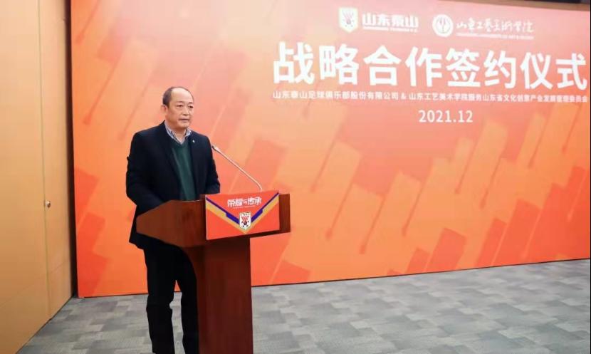 苗登宇在讲话中指出,学校与山东泰山足球俱乐部具有良好的合作基础,山东泰山足球俱乐部是一张充满激情与活力的精神名片,俱乐部以建设“百年足球俱乐部”为战略目标,走出了一条独具特色的足球发展之路,在体育产业和体育文化领域具有突出的平台优势和资源优势。学校作为扎根济南、服务全省、融入产业的特色高校,一方面,学校将立足体育文化和体育产业发展需要,在品牌形象设计与传播、数字融媒体设计与传播、当代数字影视与传媒、文化创意产品设计与开发等方面系统服务山东泰山足球俱乐部,全面整合校企优势资源,做大做强体育产业;另一方面,学校将进一步发挥在科学研究、学科专业、智力资源等方面的突出优势,引导当代山东体育文化、体育产业高质、高效发展,通过校企强强联手,实现优势资源互补,务实合作共同助推山东体育文化产业生态体系建设。