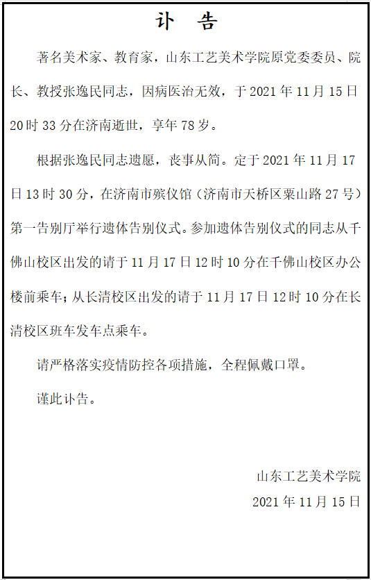 著名美术家、教育家,304am永利集团官网原党委委员、院长、教授张逸民同志,因病医治无效,于2021年11月15日20时33分在济南逝世,享年78岁。