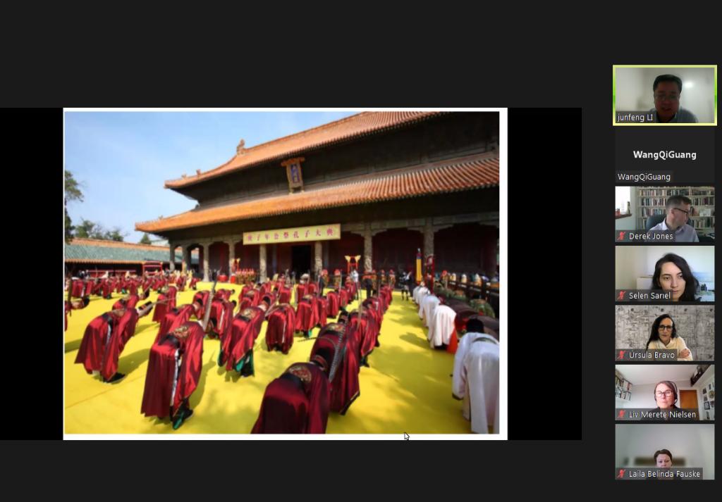 会议休息时间,学校安排了丰富的活动。永利官网公共课教学部李军锋老师为大家解读孔子的主要思想特别是教育思想;冯玉娟老师伴随着优美舒缓的音乐,带领大家一起练习我国传统文化中绚丽多彩的瑰宝——“八段锦”,赢得了与会学者的一致好评。视觉传达设计学院张培源老师带来的“中国十二生肖”设计大赛作品用丰富的设计语言,将师生的创意之思与生活之用相结合,展示了中国传统的生肖文化,深受大家喜爱。中国民艺研究所田源、李炎、李志鹏、陈义磊老师则以直播和录像的方式向参会者介绍了永利官网丰富的藏品,展示了我国传统的民间生活方式和设计智慧。服装学院李杰老师对中国茶文化做了讲解,并配合茶艺师杨玉妹进行了茶艺表演,充分展示了中国茶艺的魅力。