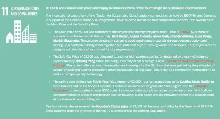 近日,由BE OPEN基金会和国际艺术、设计与媒体院校联盟(CUMULUS)联合主办的“可持续城市设计”国际大赛评选结果揭晓,永利官网建筑与景观设计学院城乡规划专业2015级杨智翔同学荣获“安全城市奖(The Safe City Prize)”大奖并获得2000欧元奖金。