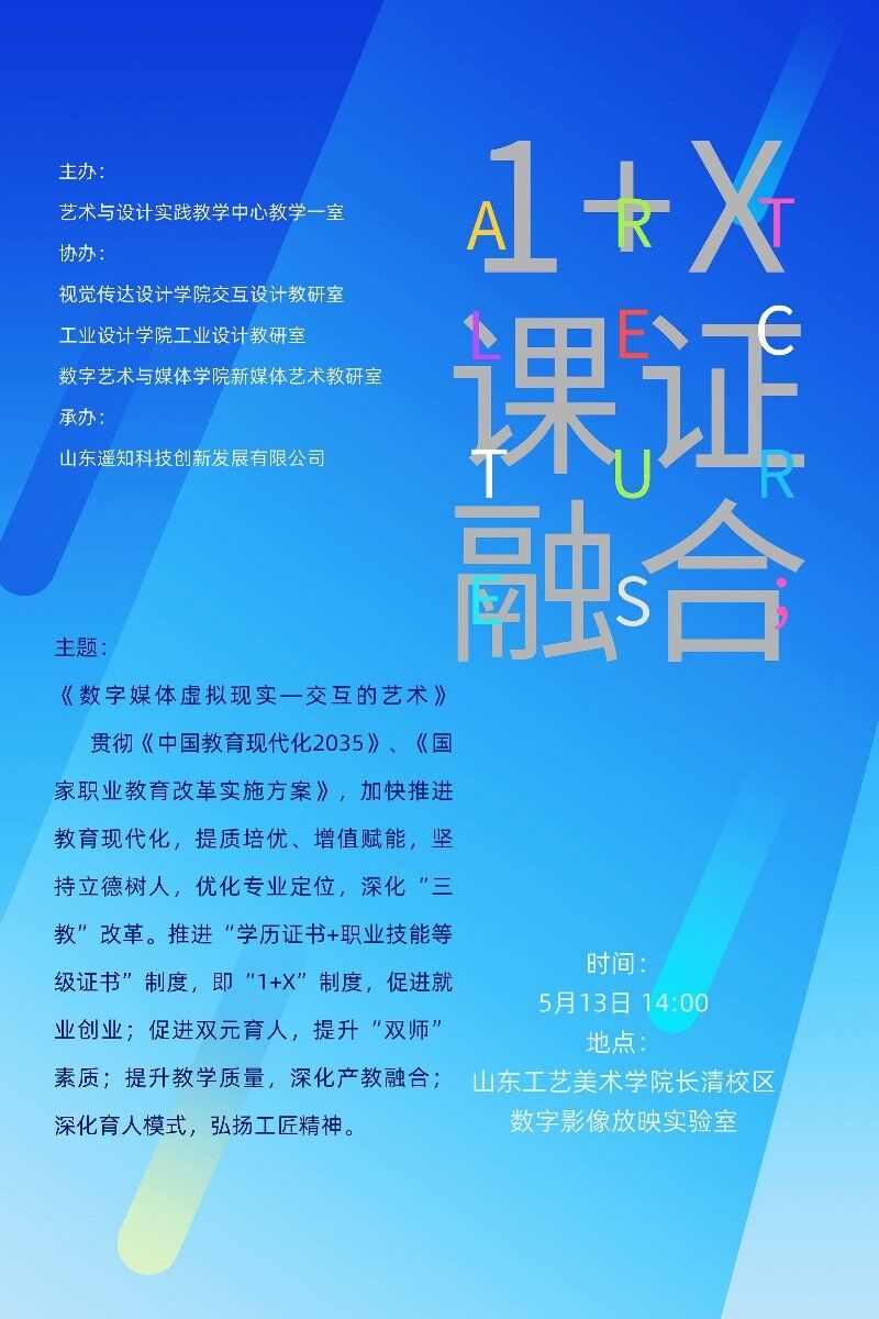 5月13日,1+X课证融合分享会《数字媒体虚拟现实——交互的艺术》主题讲座在长清校区举办。活动由艺术与设计实践教学中心主办。