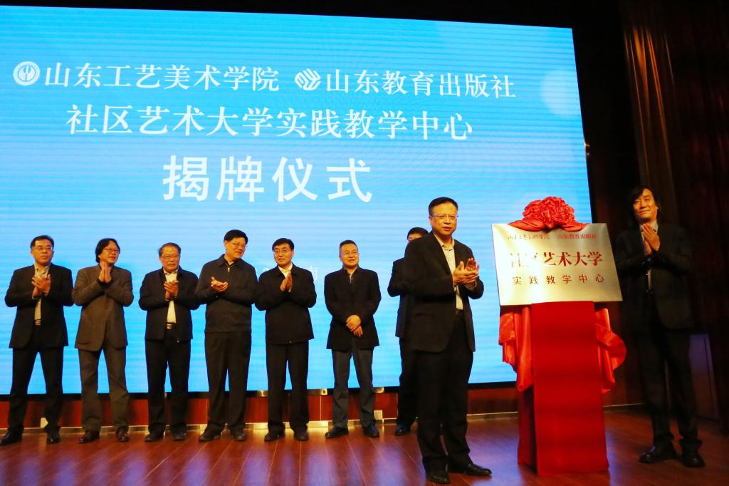 苗登宇与刘东杰代表双方签署战略合作协议。苗登宇与山东出版集团总编辑迟云代表双方共同为“304am永利集团官网、山东教育出版社·社区艺术大学实践教学中心”揭牌。
