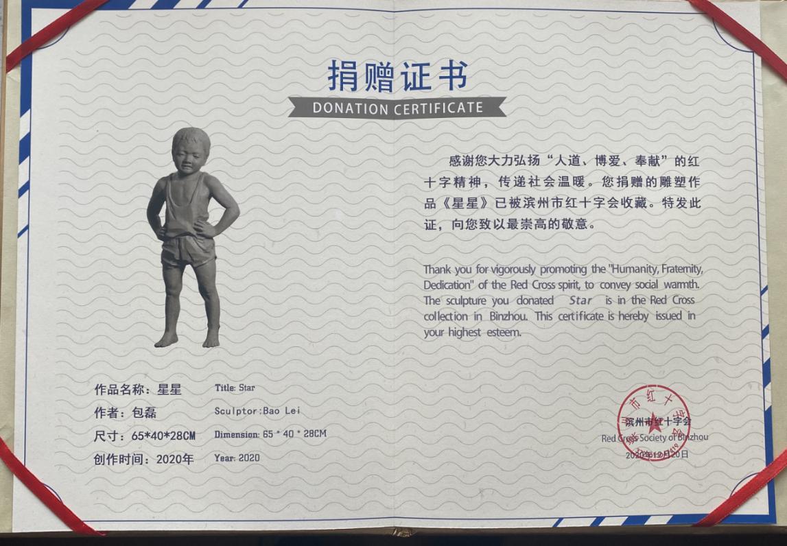 2020年10月,304am永利集团官网社会服务办公室包磊接受滨州市红十字会委托,为其创作雕塑,历经数月,几易其稿,完成雕塑作品《小星星》,并捐献给滨州市红十字文化主题公园长久存放。滨州市红十字会授予包磊捐赠证书。