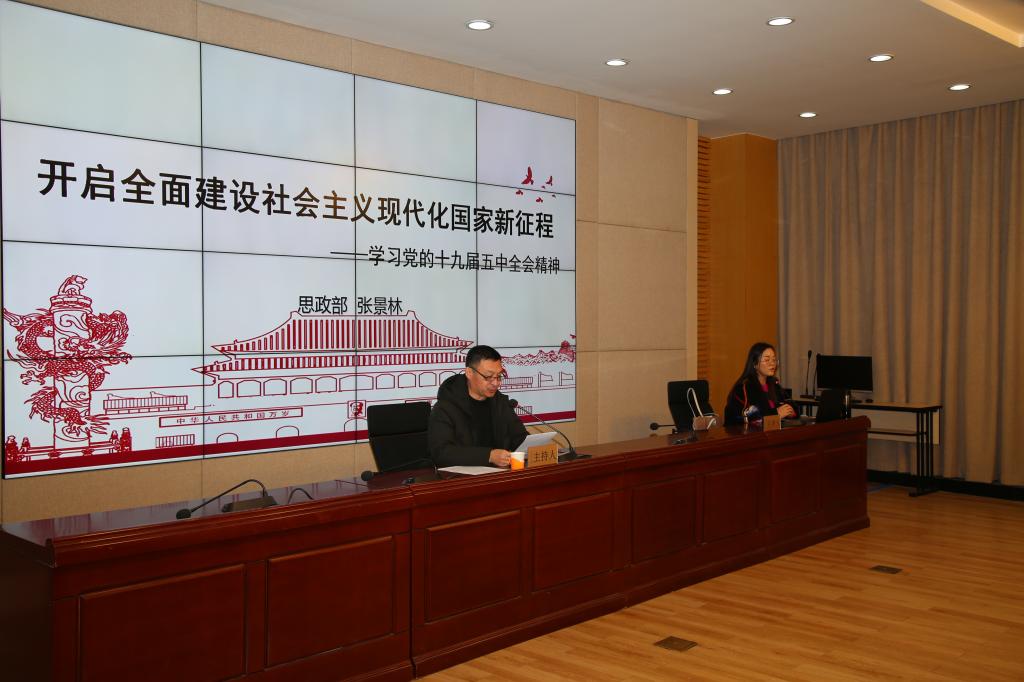 12月8日下午,省高校宣讲团成员、思想政治理论教学研究部教师张景林面向机关党总支等7个党总支师生代表作党的十九届五中全会精神宣讲报告。党委委员、宣传部部长韩文涛,党委委员、组织部部长许磊出席报告会。宣讲报告会由韩文涛主持。