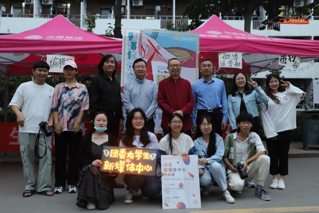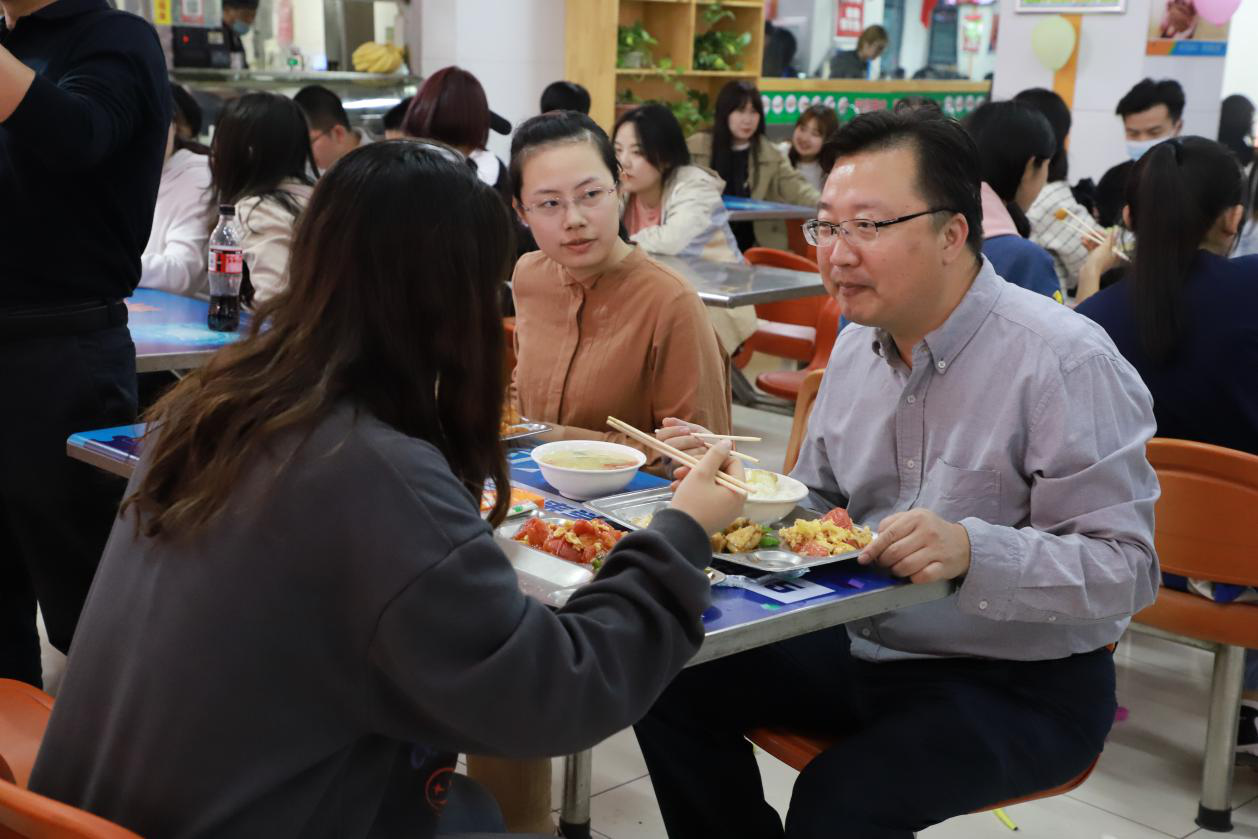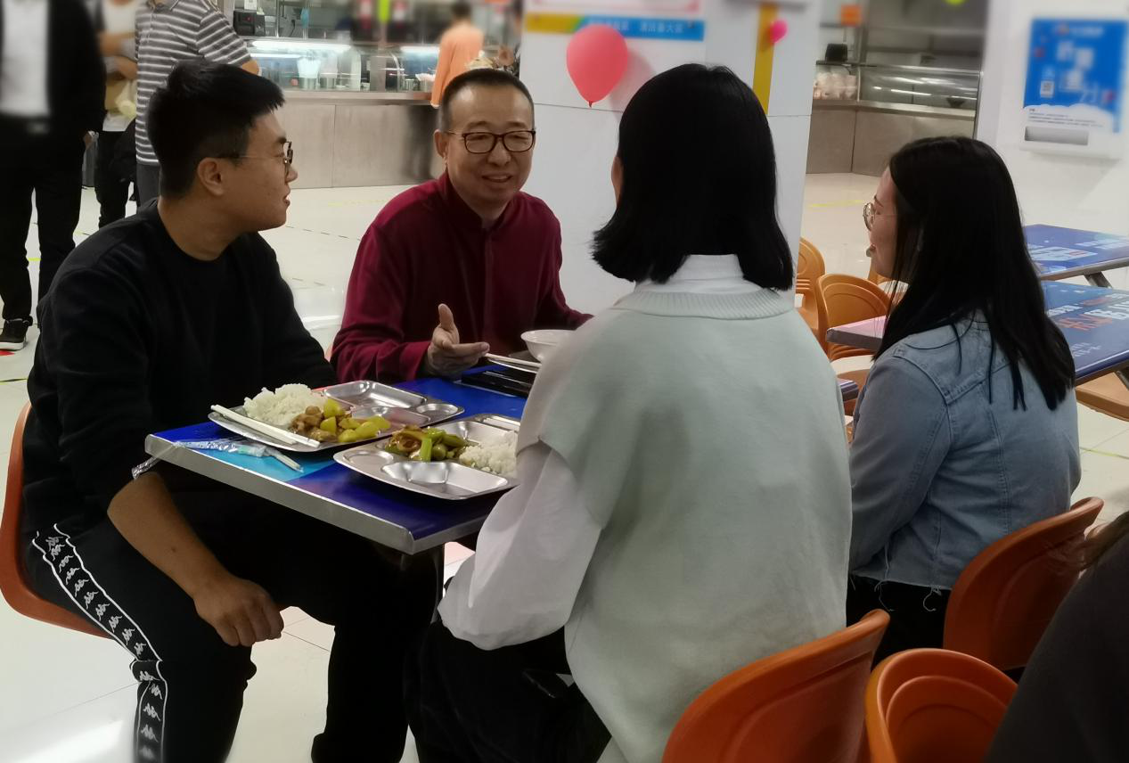 “亲爱的同学们,欢迎大家从自己的‘小家’来到工艺美院的大家庭”,在学生食堂一楼大厅,潘鲁生院长话音刚落,同学们便报以热烈的掌声。“希望同学们常怀感恩之情,既要感谢父母的养育之恩,又要感谢老师的教导之恩,更要感谢这个伟大的新时代”,他深情寄语同学们,深怀爱国之情、砥砺强国之志、实践报国之行,做担当民族复兴大任的时代新人。随后,校领导与同学们共同切开了一份象征着幸福美满、团团圆圆的蛋糕月饼。同学们随即围坐在校领导周围,纷纷聊起了自己的学习心得和生活中遇到的难题。何思清结合自身的学习和工作经历,向同学们传授学习经验,解答同学们学习成长过程中的疑惑,给学生们未来的规划和成长指明了方向。当得知钟富坤同学的家乡在青岛时,潘鲁生向他介绍了学校产教融合青岛基地的建设情况,希望他学好专业知识,为产教融合发展做出自己的贡献。