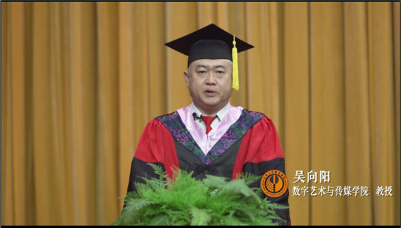 2020届硕士研究生导师、数字艺术与传媒学院教师吴向阳代表全体教师向顺利毕业的同学们表示衷心祝贺,并鼓励同学们心怀家国、敢于担当,用自己的所学和实践设计出生活的艺术和明天。他希望毕业生谨记“天工开物,匠心独运”的校训精神,勇担时代使命,用设计传播中华传统文化,用设计造福国计民生,为国家经济文化事业发展贡献自己的力量。