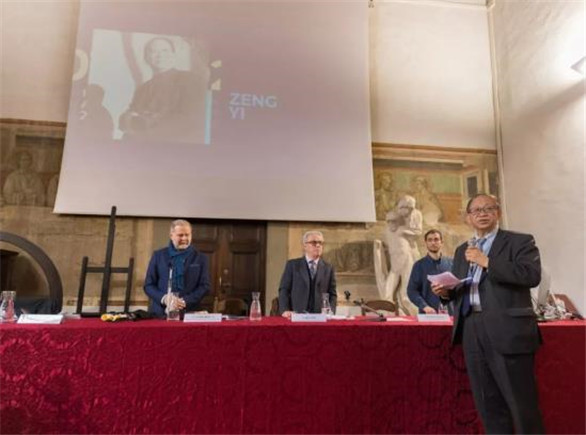 罗卡院长在宣读曾毅院士的颁奖词中说:“今天,佛罗伦萨国立美术学院向大家介绍一位来自孔子故乡的中国摄影艺术大师,同时也是中国乃至国际上的著名策展人和社会活动家,他曾获得过联合国教科文组织和中国政府给予的极高的荣誉。半个世纪以来,他先后拍摄了数万张记录和表现中国农村与广大百姓具有重要文献价值和艺术价值的作品。同时他又是中国改革开放、一个由贫穷的‘乡土中国’向富强的‘现代中国’转化历史过程的亲历者、见证者和记录者。他认为一个摄影家的责任就是要通过他的作品去推动社会发展和人类文明与进步。他对艺术的贡献和策展成就是巨大的,他的作品是令人震撼和感动的。鉴于他几十年来所取得的重要艺术成就和为中意两国文化艺术交流所做出的杰出贡献,今天我们将授予曾毅教授佛罗伦萨国立美术学院荣誉院士称号和米开朗基罗金质奖章。在学院荣誉院士颁授历史上,这是第一次将此荣誉授予中国艺术家。学院将与各位院士一起携手共同创造我们美好的未来……”
